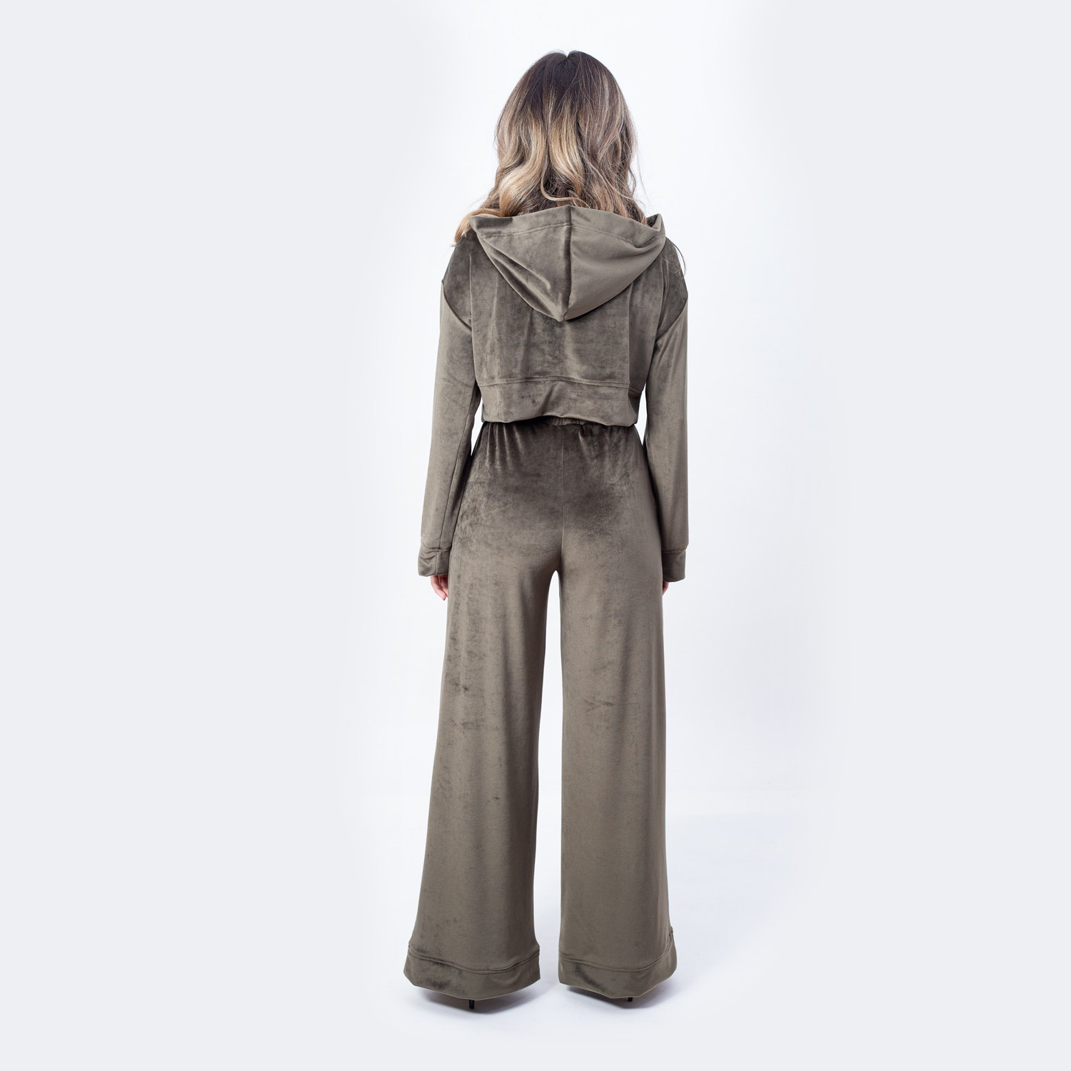 Compleul “SEAWEED COLOR “ este format din doua piese: pantaloni evazati si bluza tip “crop top” cu gluga.