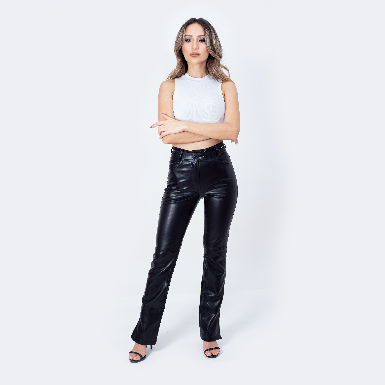 Pantaloni din imitatie de piele, cu talie inalta si croi tip jeans, prinderea se face cu mos si baba.